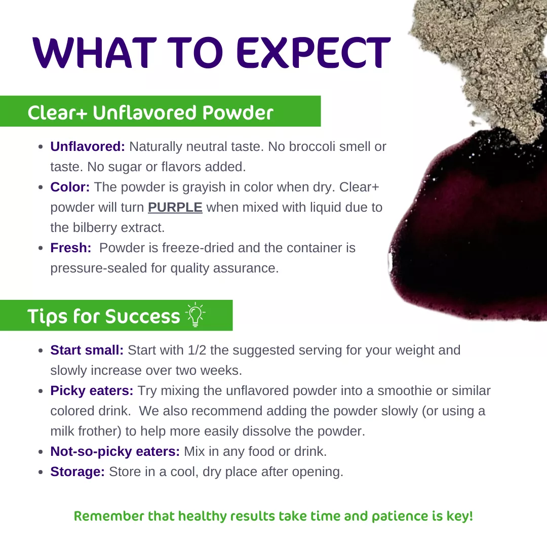 Here are tried-and-true methods from families who've found success in serving Clear+ to their loved ones. Clear+ turns purple when mixed! Keep this in mind when choosing foods and beverages.